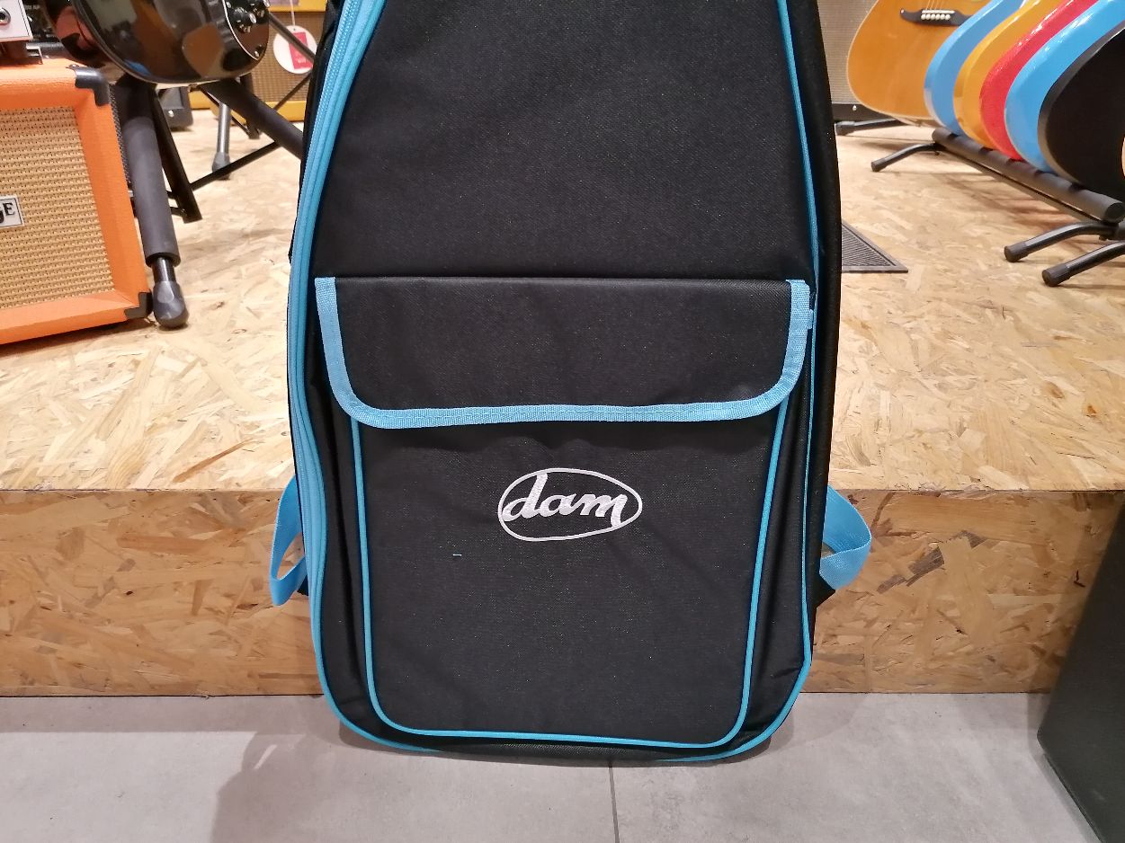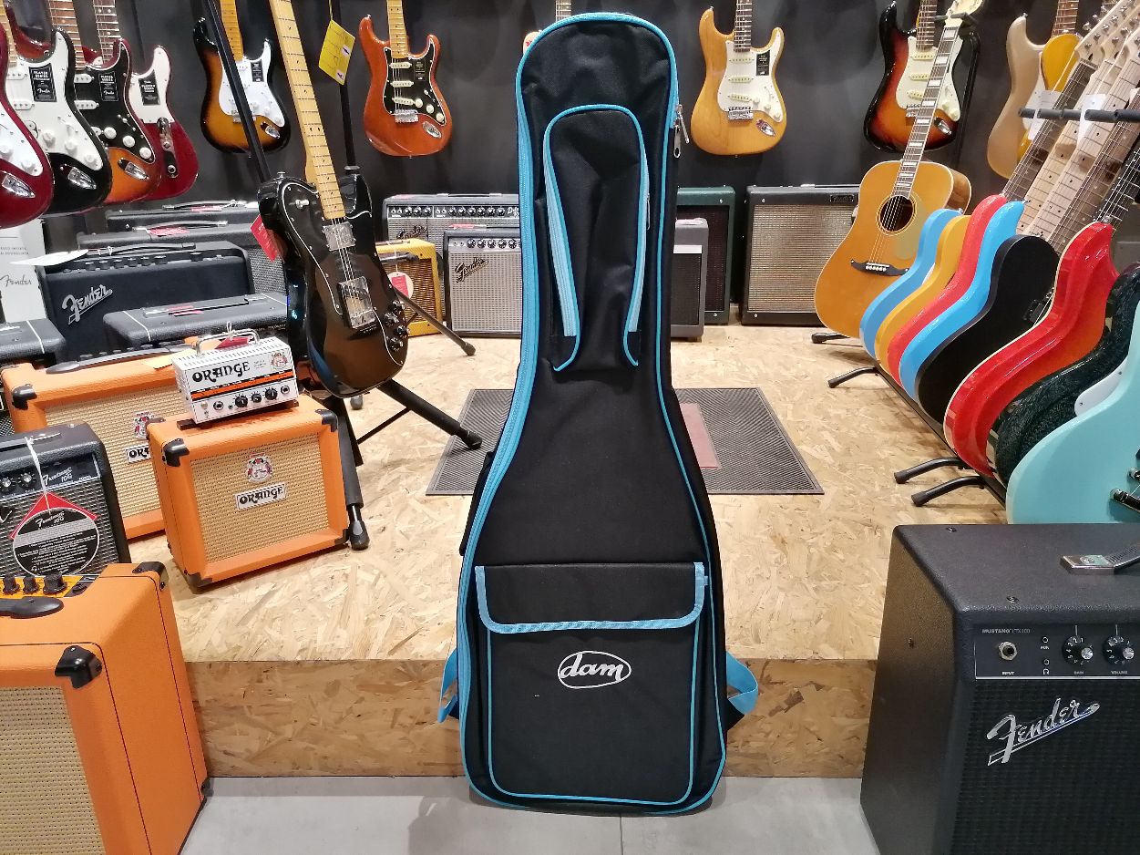 Borsa morbida per chitarra elettrica, robusta, antistrappo con imbottitura da 12 mm, Nero rifinitura in azzurro con logo bianco DAM sul fronte.