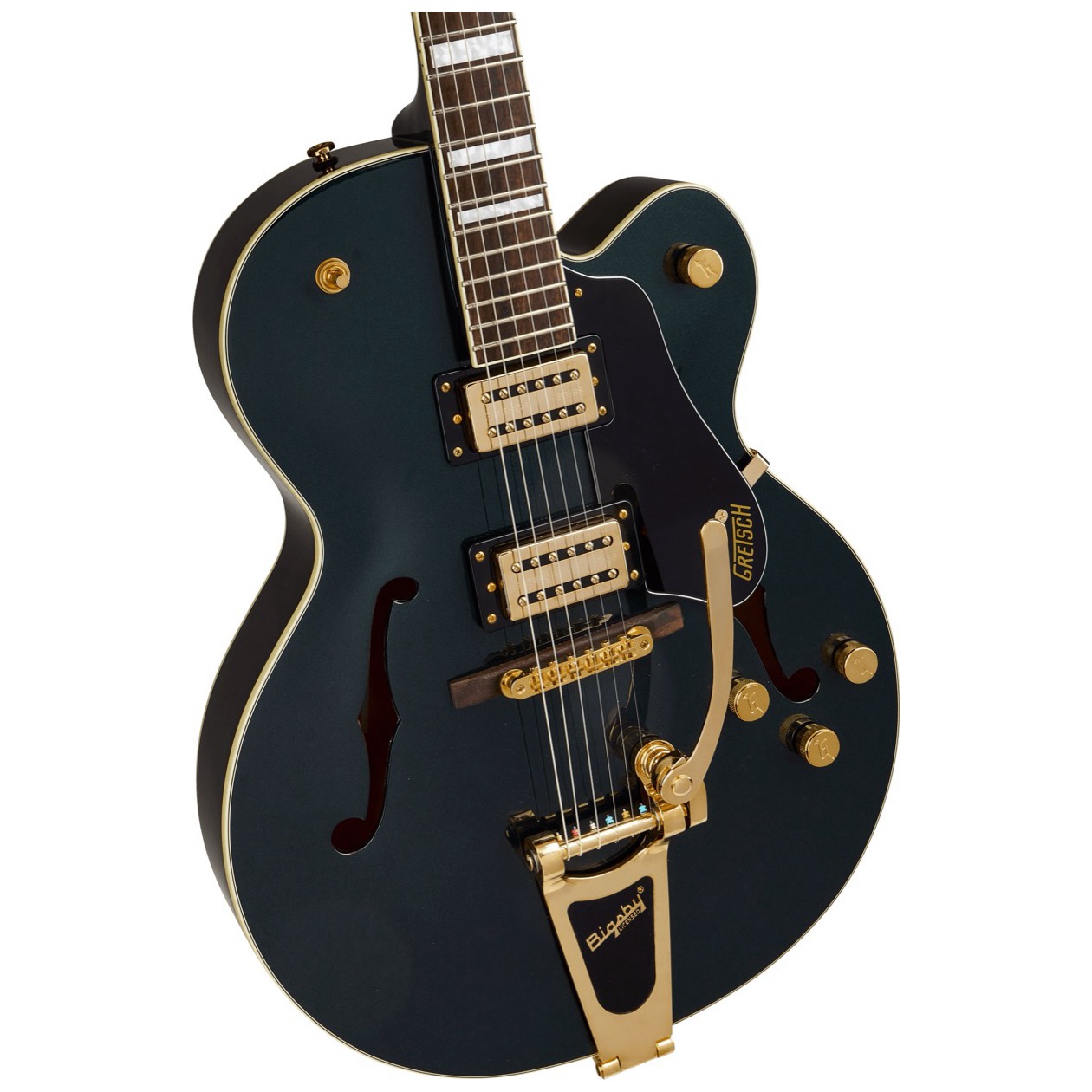La Limited Edition G2420TG Streamliner Hollow Body Single-Cut con Bigsby® è progettata per il chitarrista moderno che desidera qualcosa di più della norma. Con hardware dorato scintillante, manopole di controllo G-Arrow in metallo e intarsi Big Block in madreperla, la G2420TG offre un suono moderno, un’elettronica aggiornata e uno stile autenticamente elegante, dando vita all’ultima versione di That Great Gretsch® Sound!™